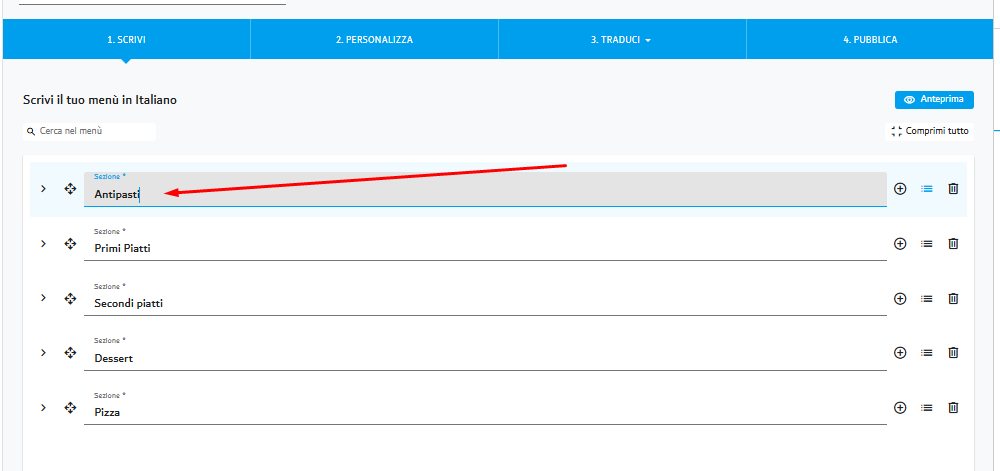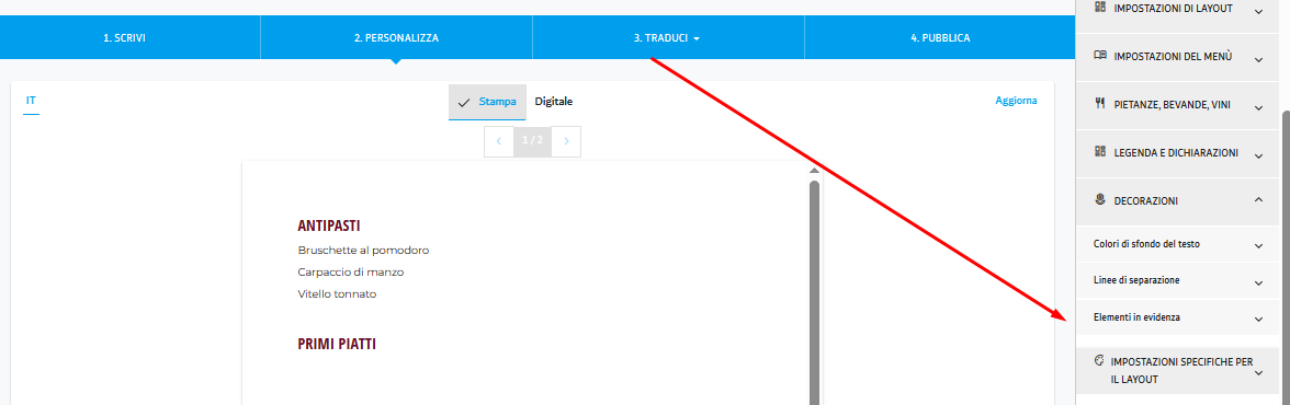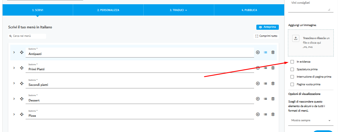 - Seleziona l'elemento: clicca sull'elemento del menu (sezione, piatto, descrizione, ecc.) che vuoi evidenziare.