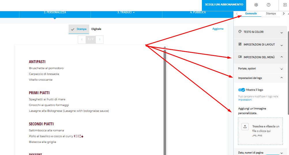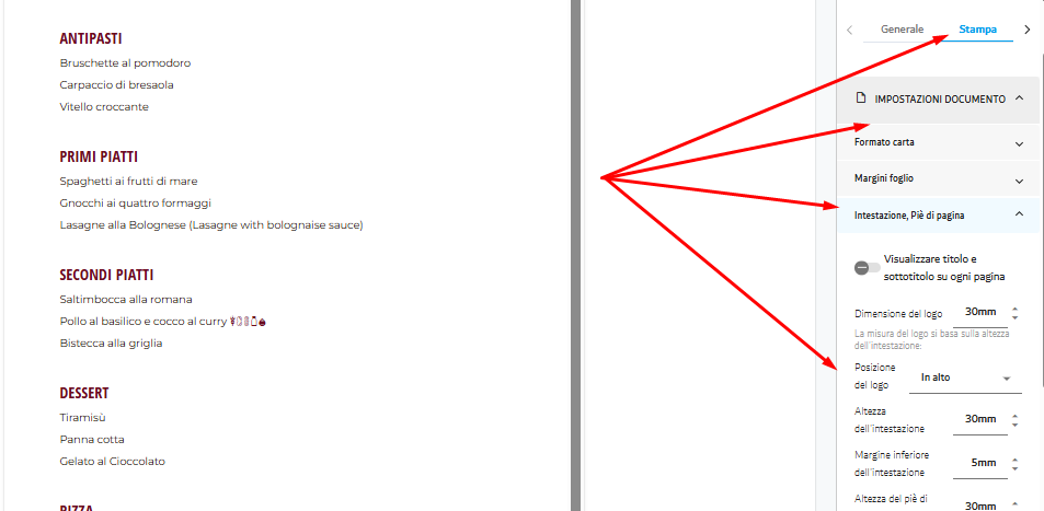 Puoi posizionare il tuo logo sia nella parte superiore che inferiore dell'intestazione e regolarne le dimensioni. Questa flessibilità ti permette di personalizzare il tuo logo in modo che si adatti meglio al design e al layout complessivo del tuo menu.