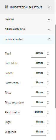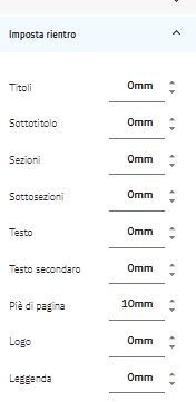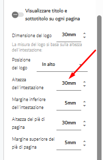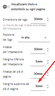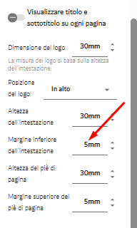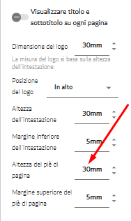 Simile all'intestazione, l'altezza del piè di pagina può essere regolata per adattarsi alle tue esigenze di design. Inserisci l'altezza desiderata in millimetri (mm). Il piè di pagina è tipicamente usato per informazioni aggiuntive come dettagli di contatto, link ai social media o disclaimer legali.