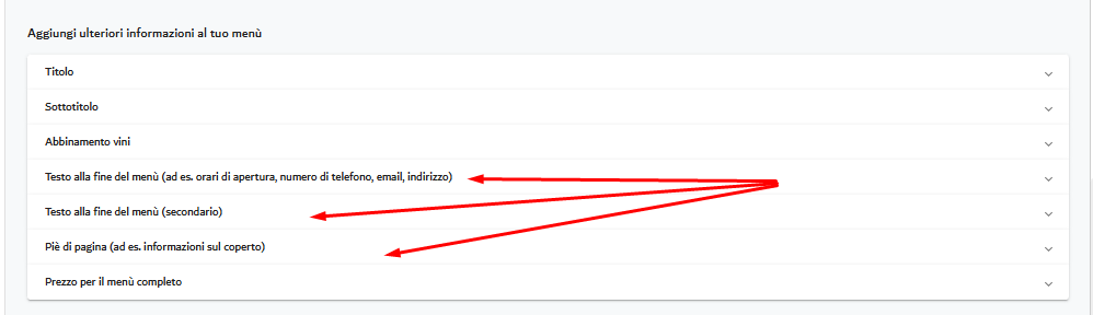 - Testo alla fine del menu (ad es., orari di apertura, dettagli di contatto),