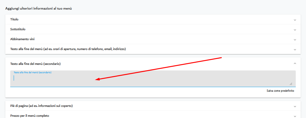 Per aggiungere una nota a piè di pagina o un testo alla fine del menu, segui questi passaggi: