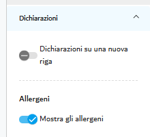 Oltre alle scelte menzionate, puoi scegliere di presentare gli allergeni su una riga distinta attivando l'interruttore in "Legenda e dichiarazioni" > "Dichiarazioni."